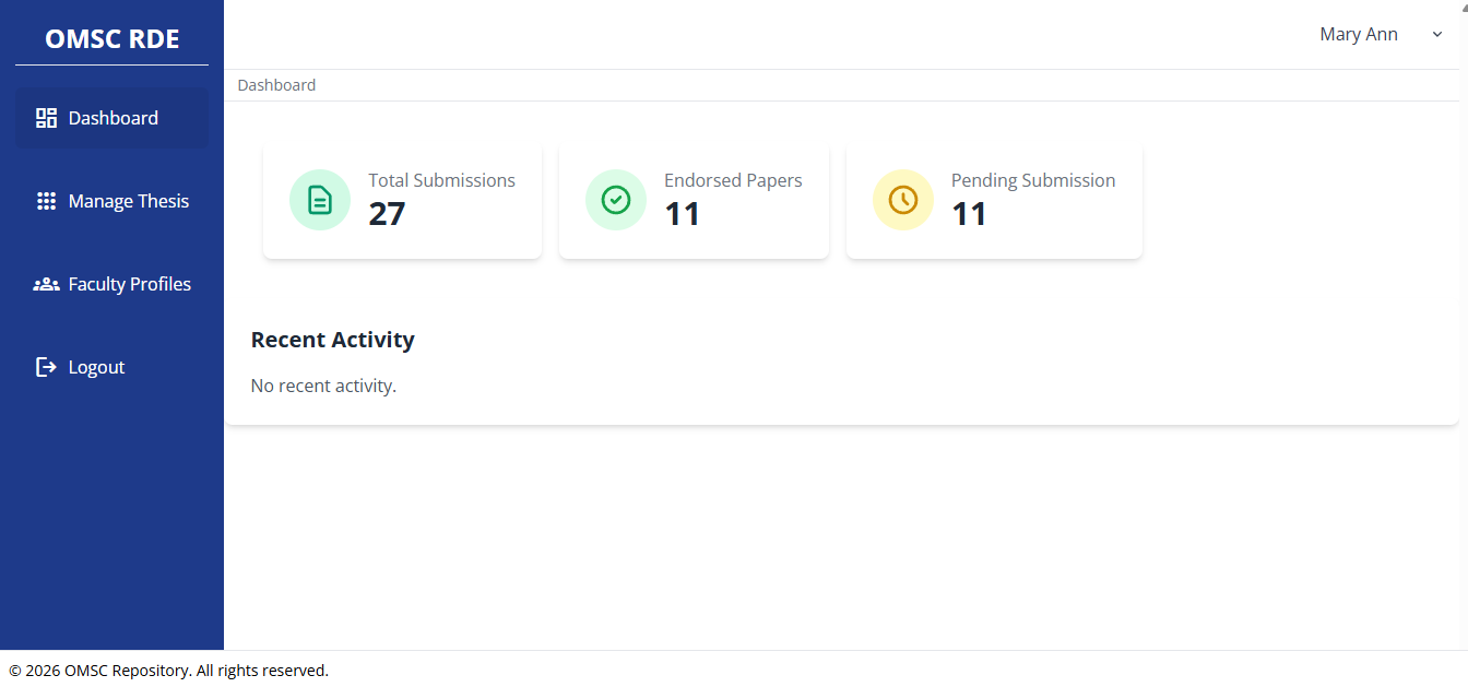 It a Node.js project with MongoDB, and other libraries and plugins. OMSC Repository is a research repository that allows users to manage and track repository data efficiently. It provides features for creating, tracking, and managing data records in a user-friendly interface. The system is designed to streamline data management processes and improve productivity.